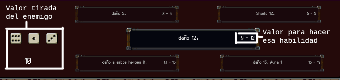 Habilidades: El enemigo lanzará 3 dados al principio de la ronda y eliguira la habilidad según lo sacado, a mayor valor, mejor la habilidad.